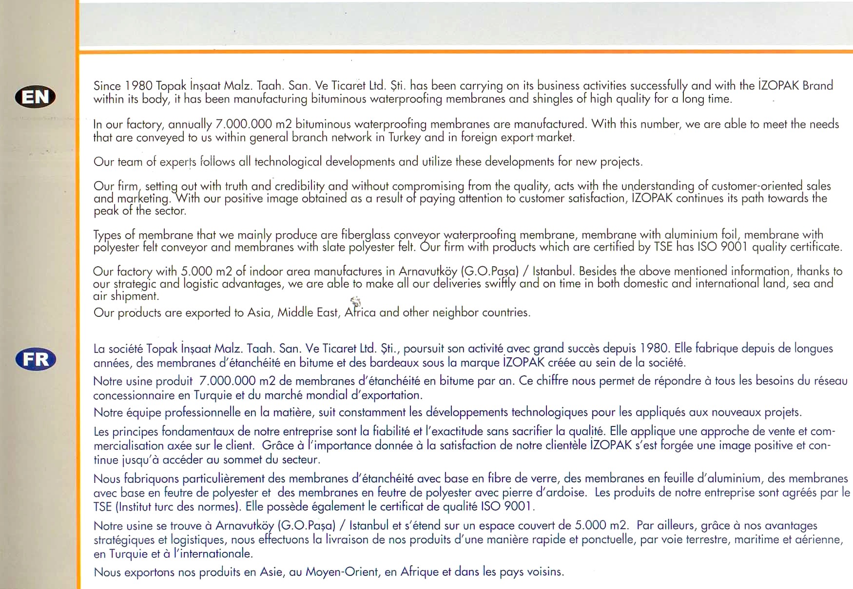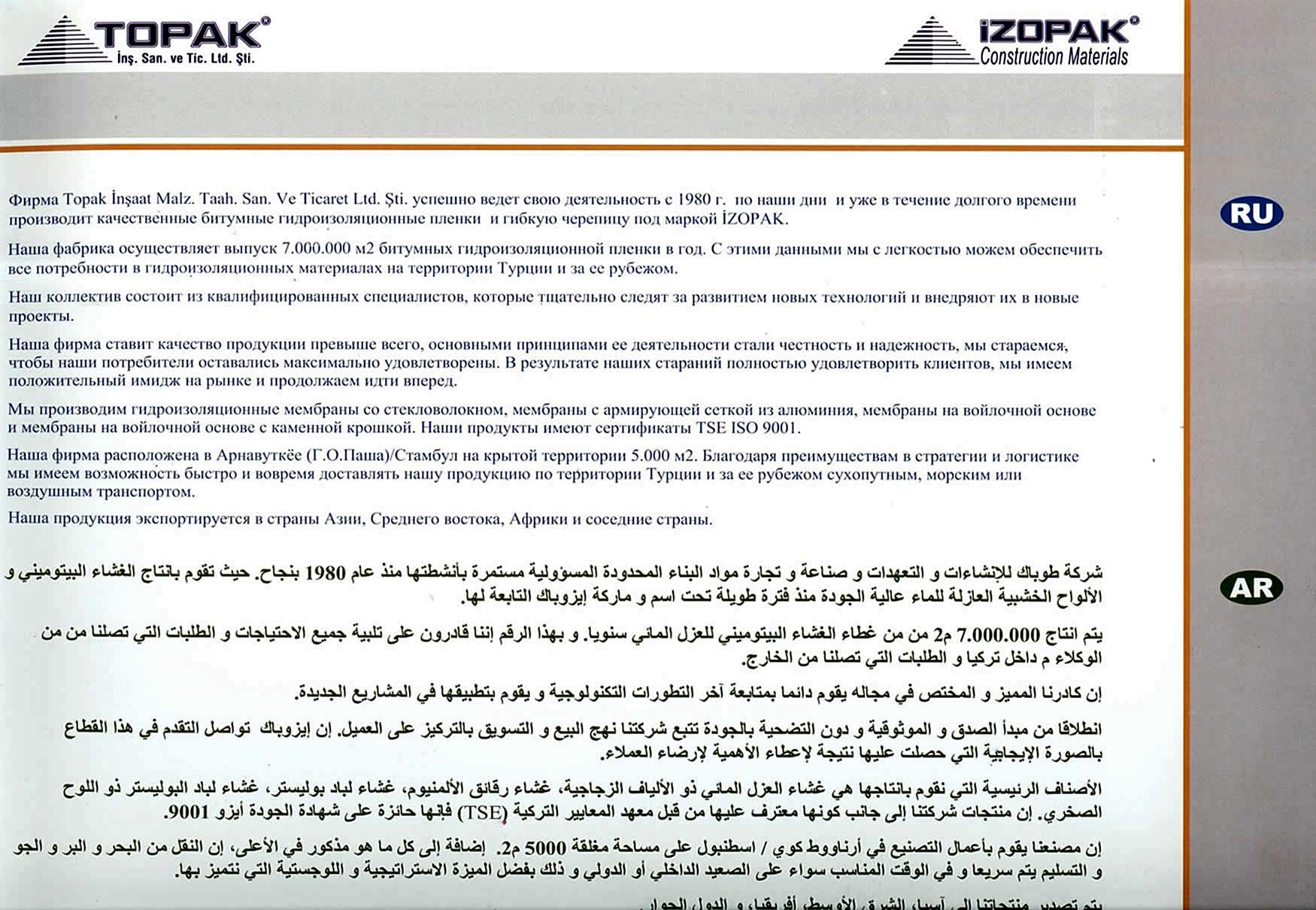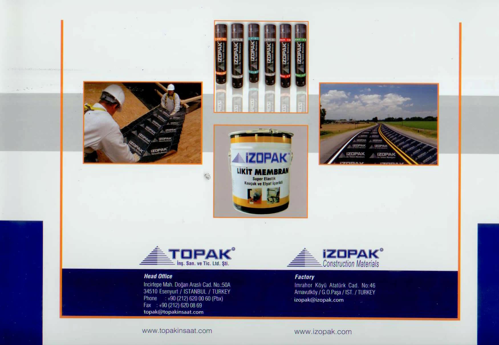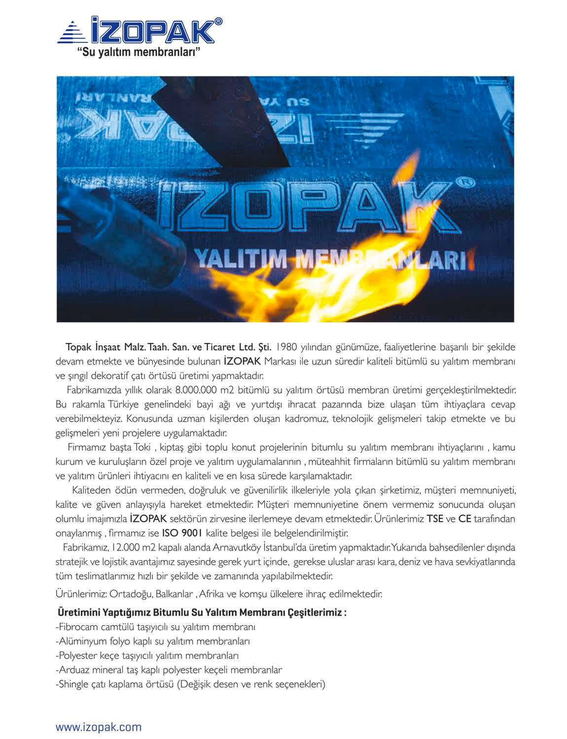 Topak İnşaat Malz. Taah. San. ve Ticaret Ltd. Şti. 1980 yılından günümüze, faaliyetlerine başarılı bir şekilde devam etmekte ve bünyesinde bulunan İZOPAK Markası ile uzun süredir kaliteli bitümlü su yalıtım membranı ve şıngıl dekoratif çatı örtüsü üretimi