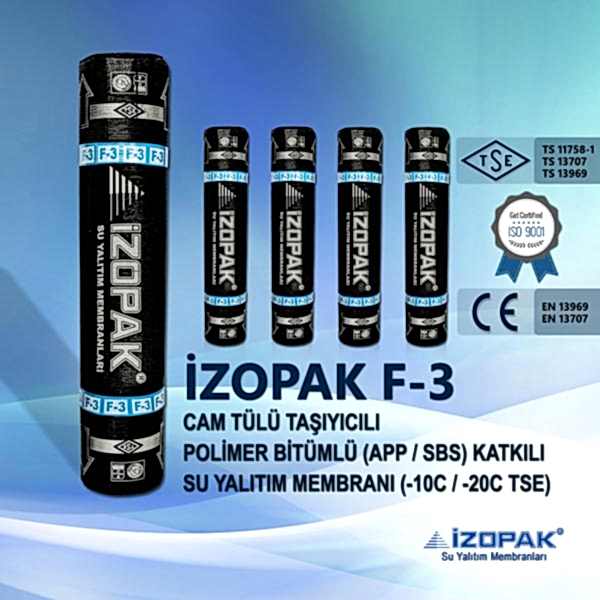 F-3 bitümlü su yalıtım membranı tel takviyeli fibrocam camtülü taşıyıcılı, APP (Atactic Polypropylene) katkılı,her iki yüzü polietilen film kaplamalı olup taşıyıcının bitüm asfalt kaplanması ile elde edilir. F-3 Fibrocamlı su yalıtım membranı genel olarak çatılarda, pergule ve su yalıtım izolasyonu gerektiren yalıtım noktalarında kullanır.