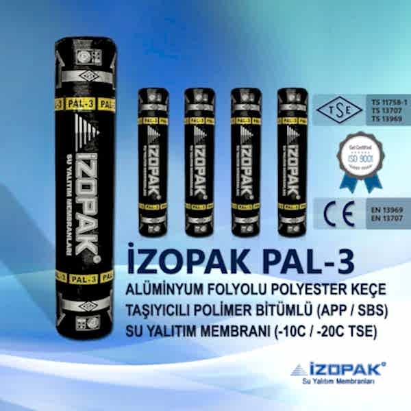 PAL-3 Keçeli ve Alüminyum folyolu bitümlü su yalıtım membranı fibrocam camtülü taşıyıcının , APP (Atactic Polypropylene) katkılı bitum asfalt bitumen ile kaplanarak imal edilir. Bir yüzü polietilen film kaplamalı olup, diğer yüzü alüminyum folyo ile kaplanarak imal edilir. PAL-3 keçeli folyolu fibrocamlı su yalıtım membranı genel olarak çatılarda baca dibi , bina ek yerleri folyolu su yalıtım izolasyonu gerektiren yalıtım noktalarında kullanır.