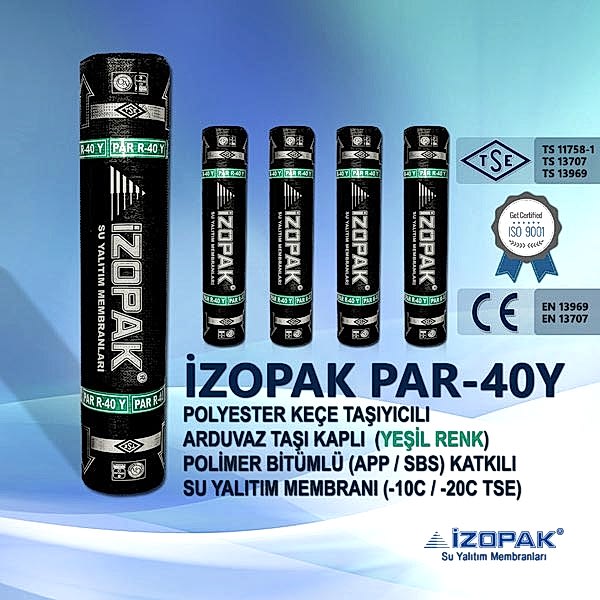 PAR-40K Arduaz taşı kaplı polyester keçeli bitümlü su yalıtım membranı , polyester keçenin APP (Atactic Polypropylene) katkılı bitum penetrasyon asfaltın kaplanması ile elde edilir. Bir yüzü polietilen film kaplama diğer yüz arduaz mineral taş ile kaplanan polyester keçeli membran son işlem ile elde edilir. PAR-40Y arduazlı membran polyester keçeli su yalıtım membranı genel olarak çatılarda, pergule ve su yalıtım izolasyonu gerektiren yalıtım noktalarında kullanır.