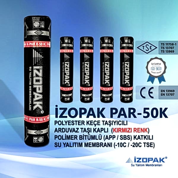 PAR-50K Arduaz taşı kaplı polyester keçeli bitümlü su yalıtım membranı , polyester keçenin APP (Atactic Polypropylene) katkılı bitum penetrasyon asfaltın kaplanması ile elde edilir. Bir yüzü polietilen film kaplama diğer yüz arduaz mineral taş ile kaplanan polyester keçeli membran son işlem ile elde edilir. PAR-50K arduazlı membran polyester keçeli su yalıtım membranı genel olarak çatılarda, pergule ve su yalıtım izolasyonu gerektiren yalıtım noktalarında kullanır.